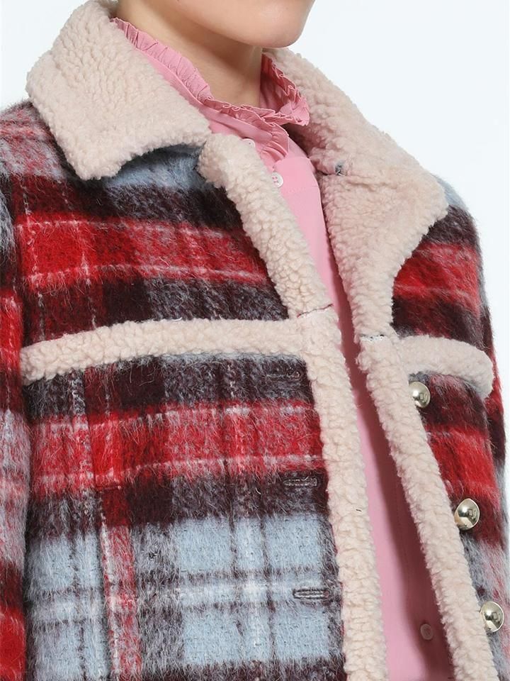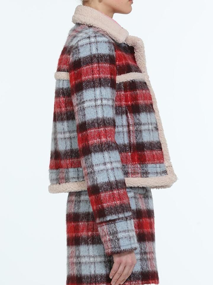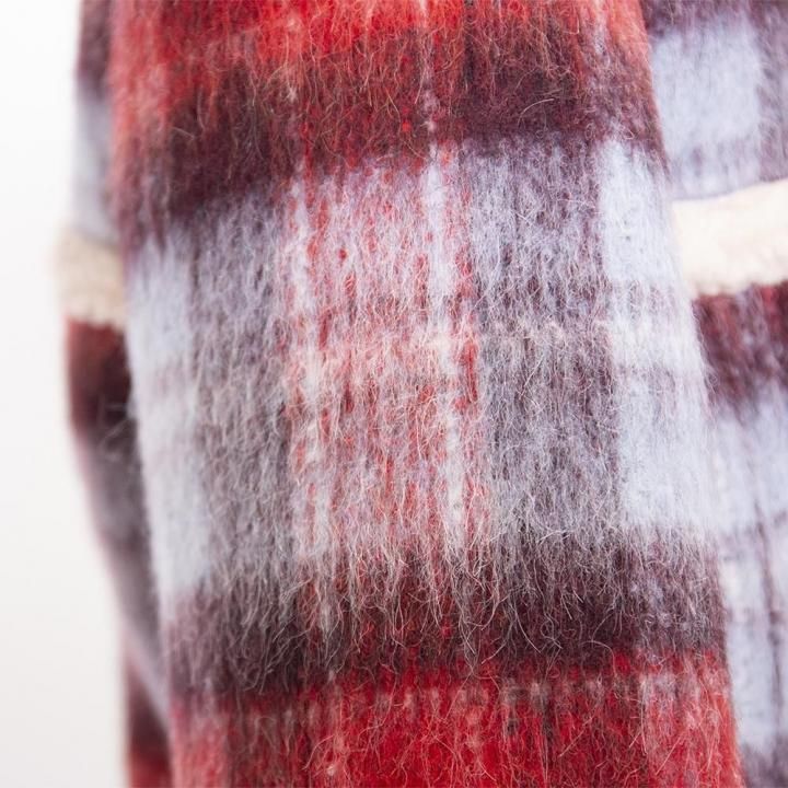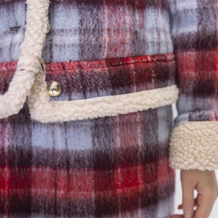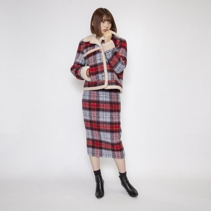 レッド、ライトブルー、ブラウンの3色を織り交ぜたウール混のチェック生地が、目を惹く一着。あたたかみのあるベージュのボアを、襟・前立て・裾にトリミングし、シーズンらしいほっこりとしたニュアンスをプラスしています。