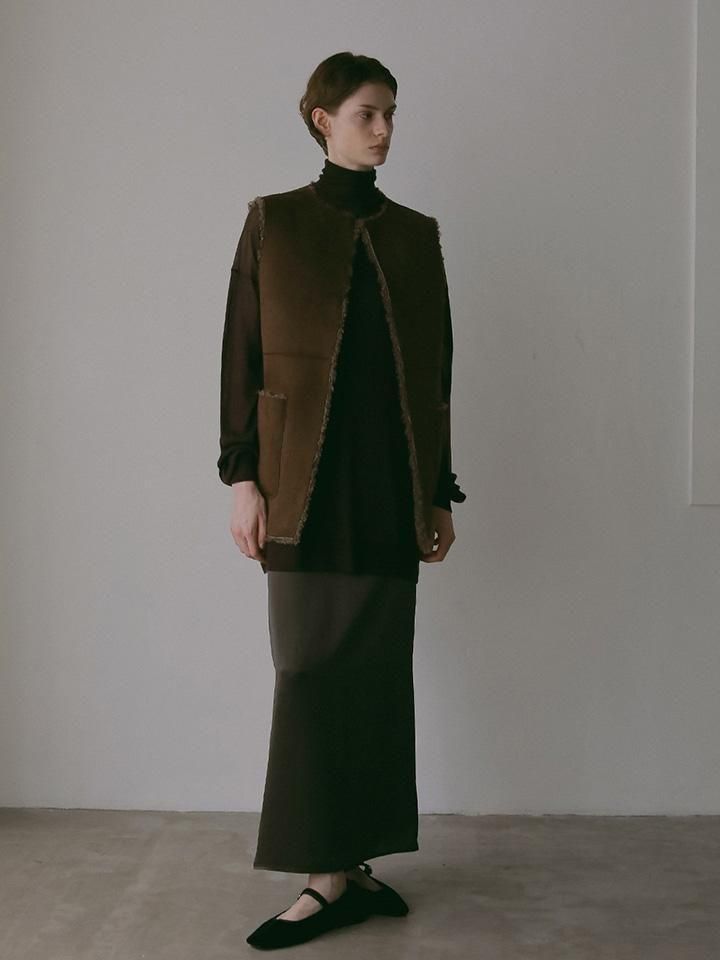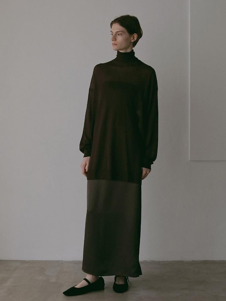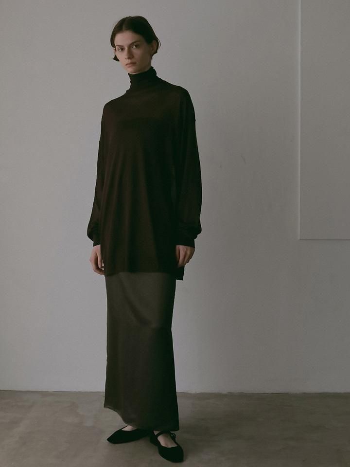 ほんのりとした光沢をたたえるアセテート素材が、動きに合わせて柔らかく揺れ、品のある存在感を演出します。程よい厚みと落ち感があるため、身体のラインを拾いすぎず、すっきりとしたIラインを自然に描いてくれるのも魅力のひとつ。