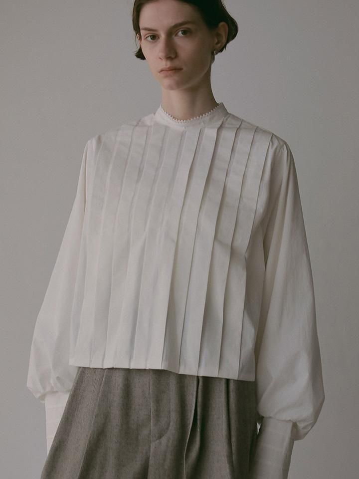 やや短めの着丈に、フロントに幾重にも施されたタックが繊細な印象を演出。立体感のあるフォルムながら、すっきりとしたバランスに整えられており、1枚で着映えするアイテムです。