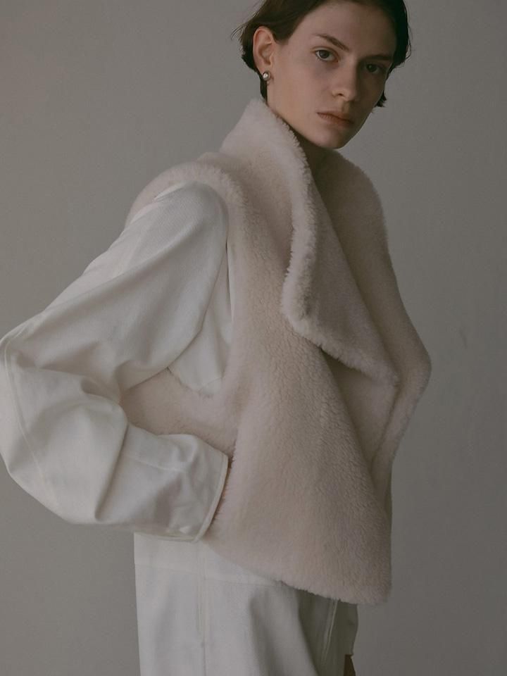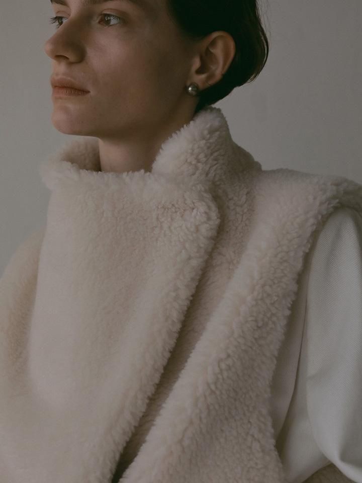 厚みのあるボア素材にウールを混紡することで、見た目にもあたたかく、軽やかさと保温性を兼ね備えた仕上がりに。ラフなニュアンスを持ちながら、どんなスタイリングにもすっと馴染む万能な一着です。