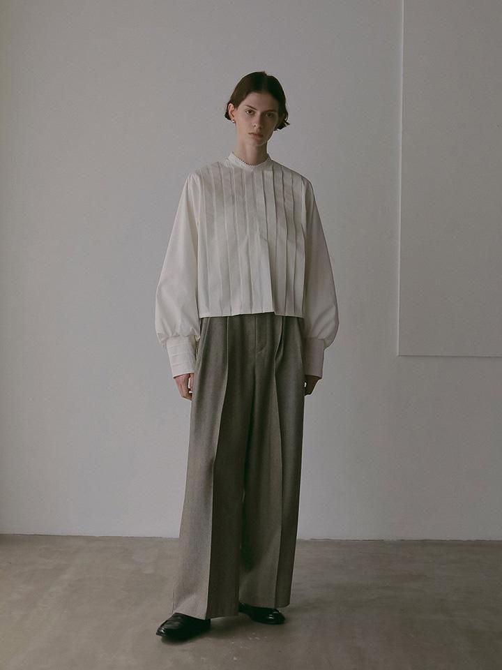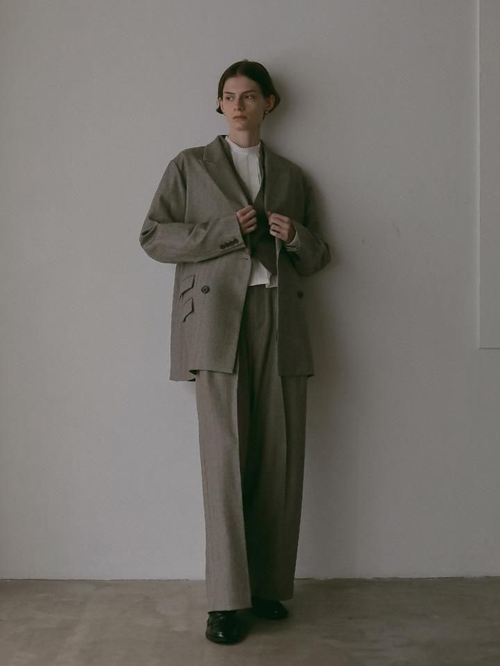 きちんと感と抜け感のバランスが絶妙な、ややワイドなストレートシルエットで、シーンを選ばず着用いただける万能アイテムです。細かなヘリンボーン柄が、さりげないニュアンスを生み出し、無地ライクに使えるのも嬉しいポイント。ミニマルなトップスと合わせてもどこか奥行きのある印象に仕上がります。
