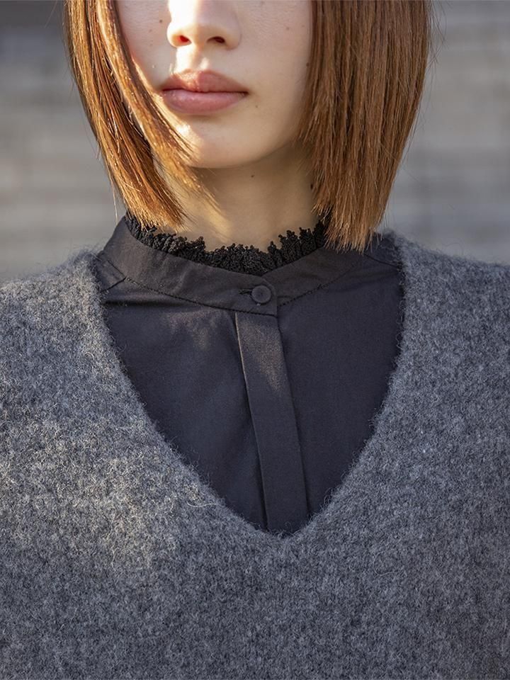 ニットやスウェットのインナーとして、衿や袖口のレースをのぞかせるレイヤードスタイルもおすすめ。